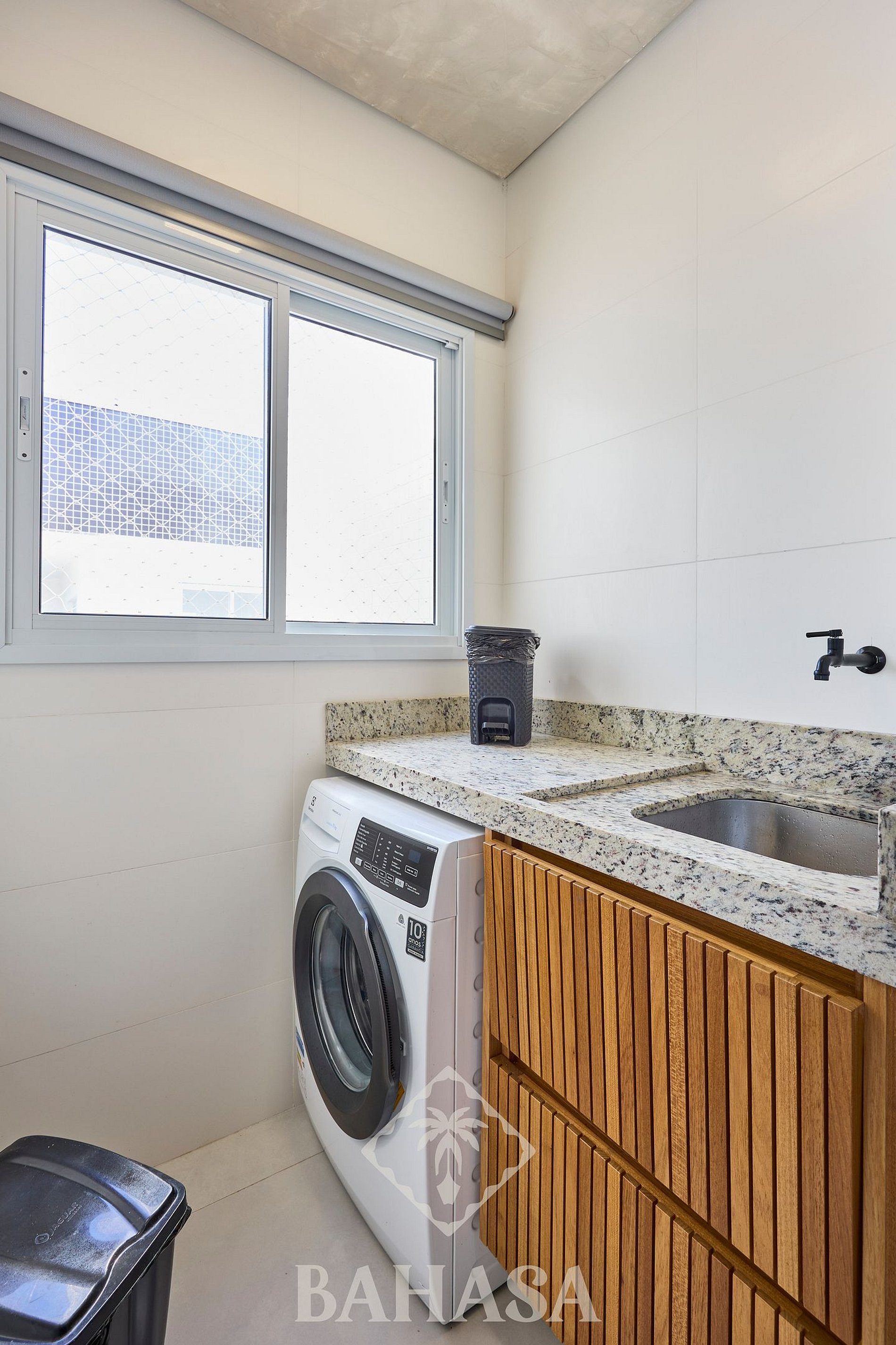 Uma área de serviço com tanque e uma lava-roupa.