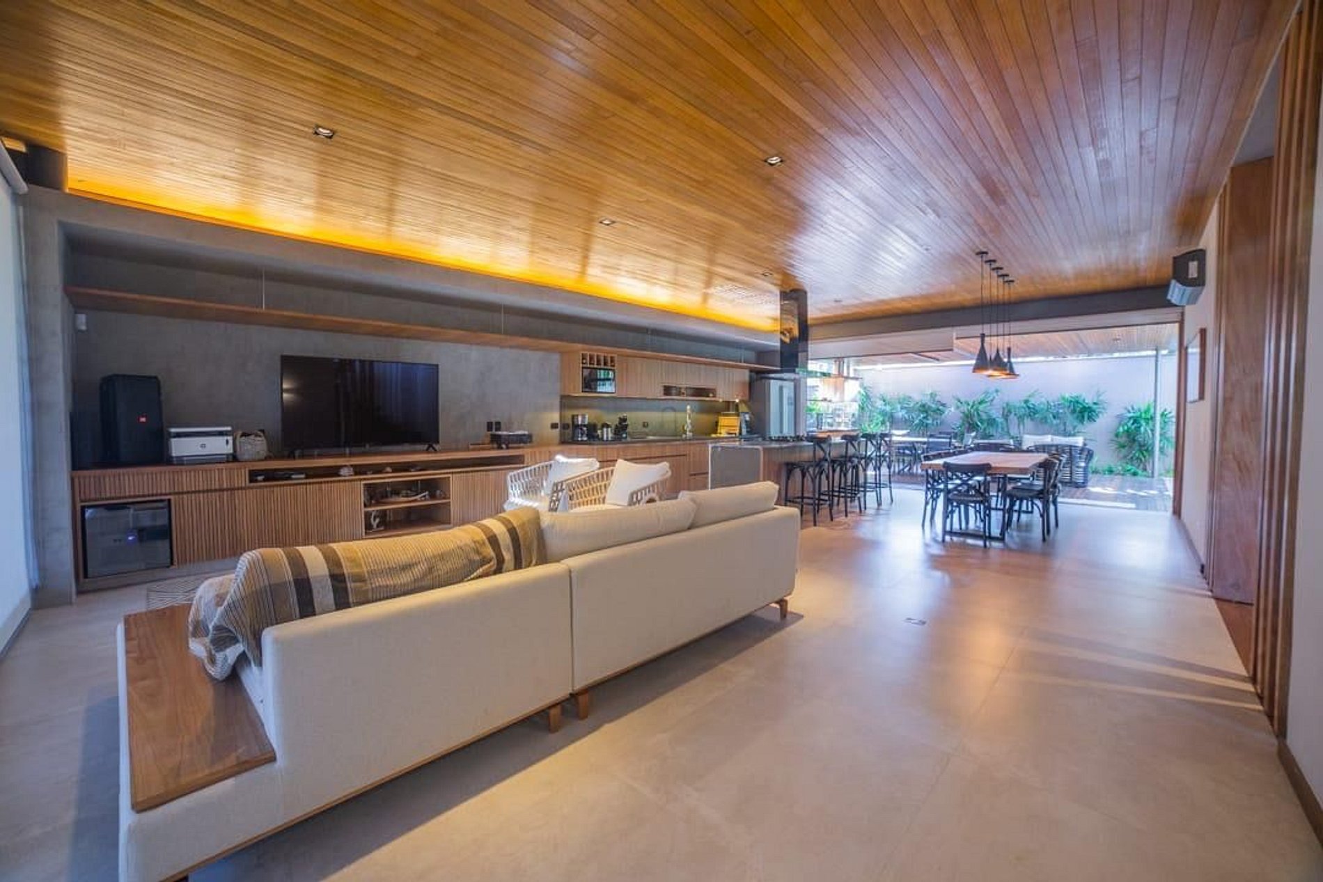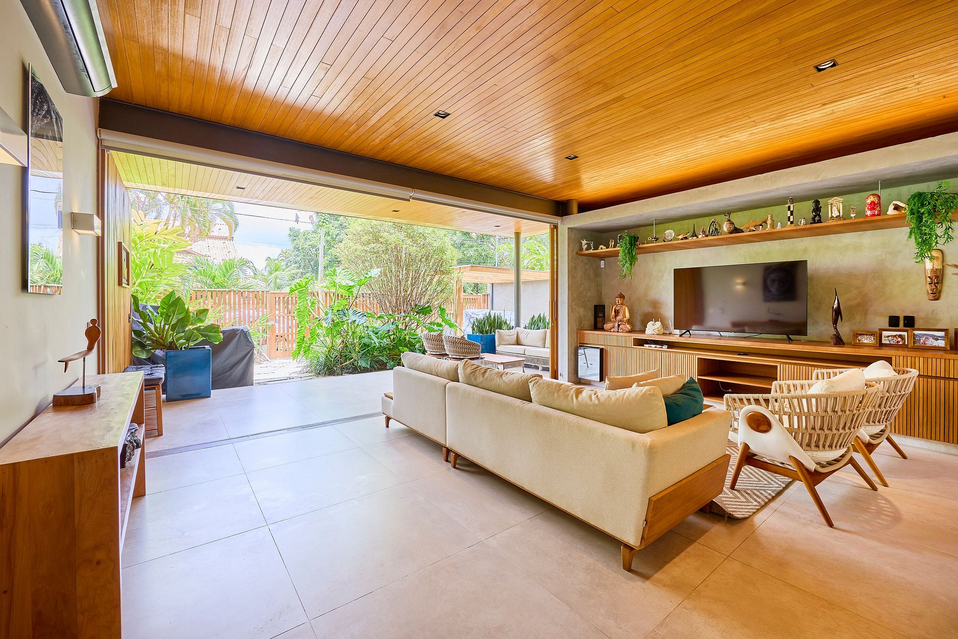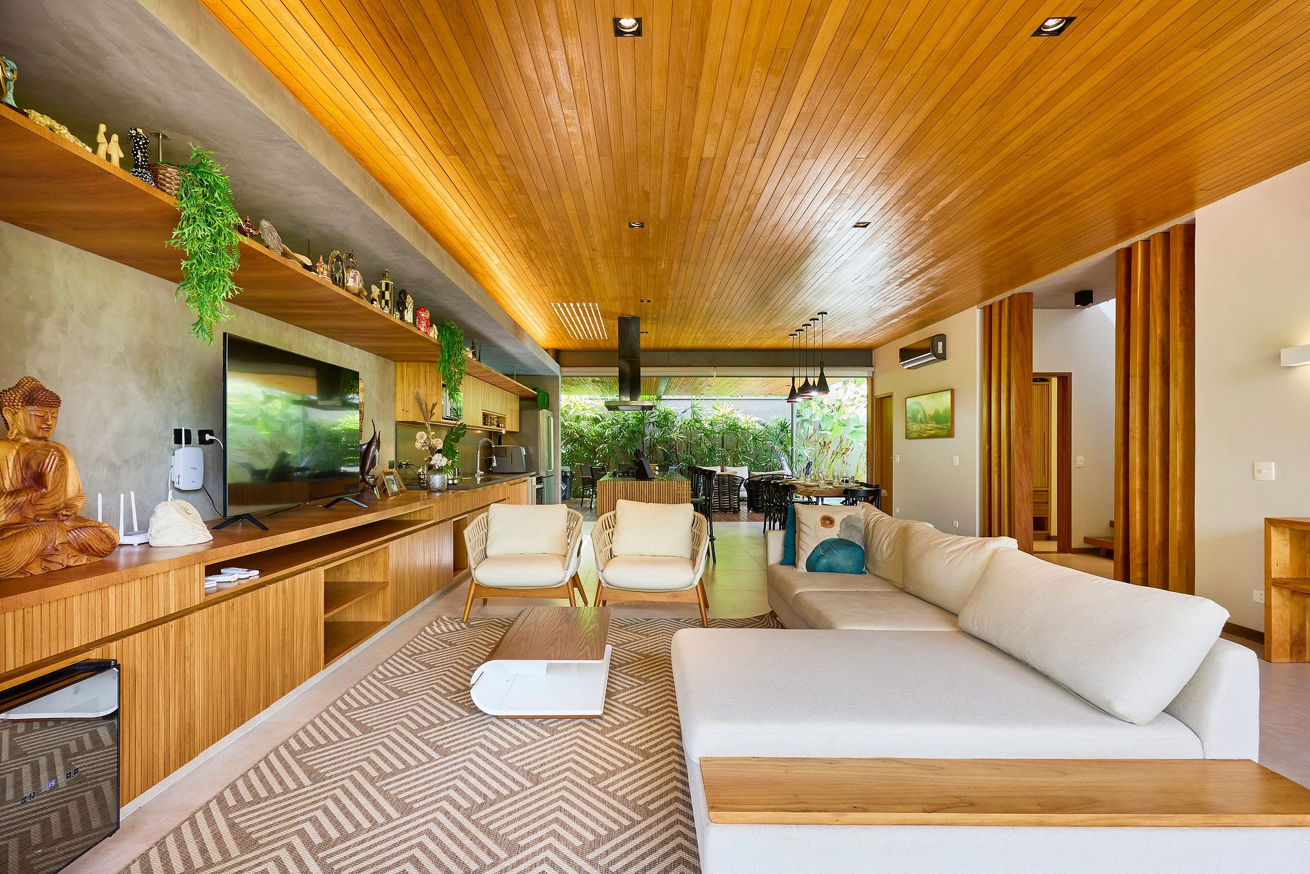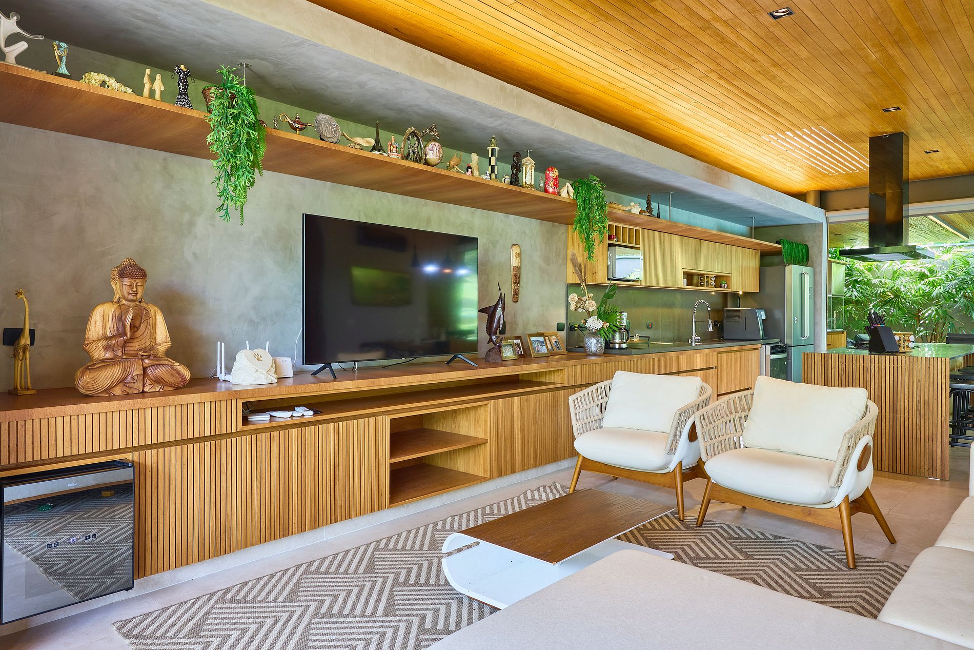 • Sala de estar: Smart TV com acesso a Netflix, Spotify e YouTube, integrada com a cozinha e a área externa.