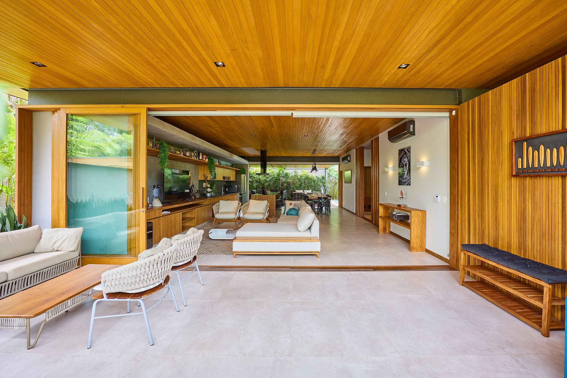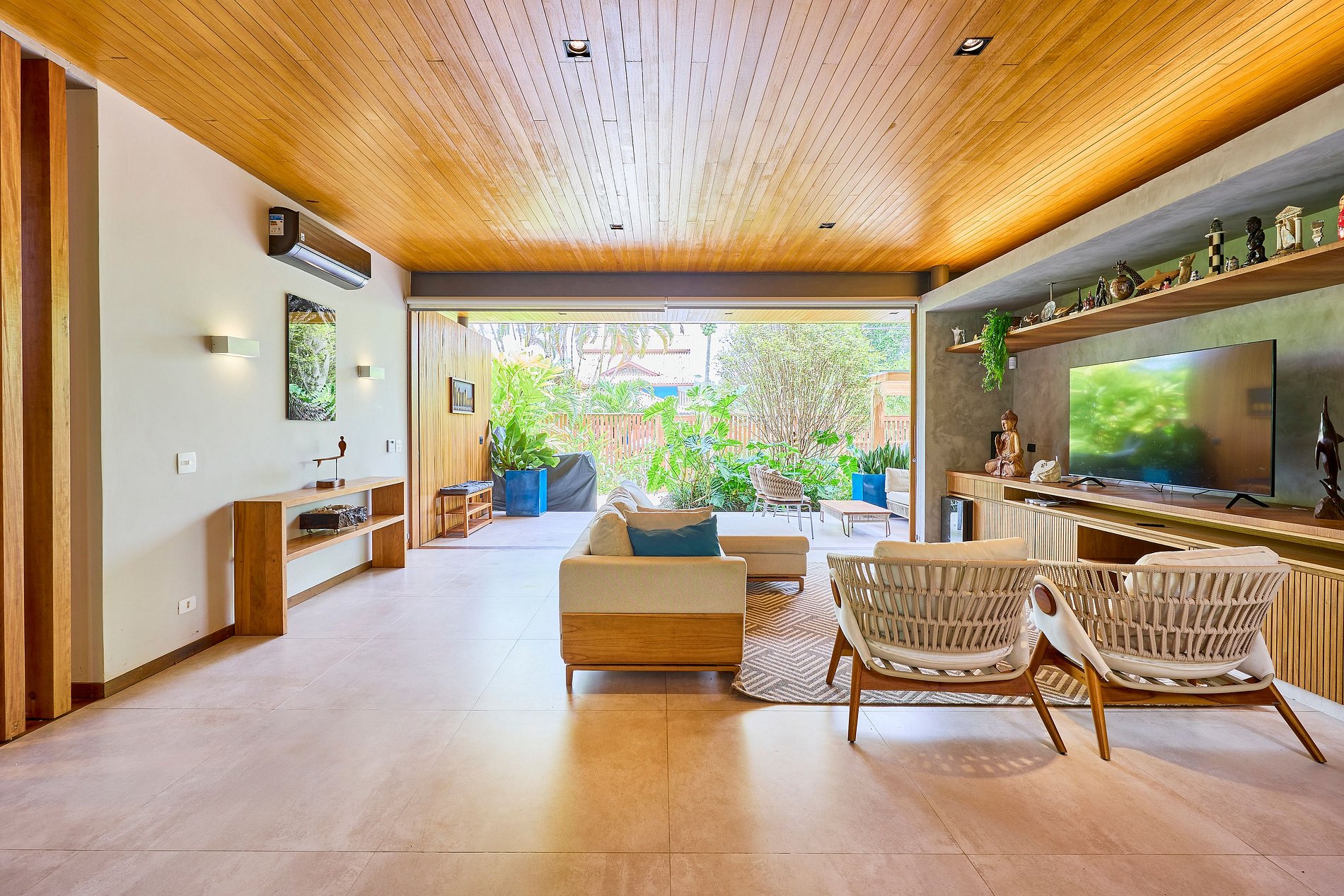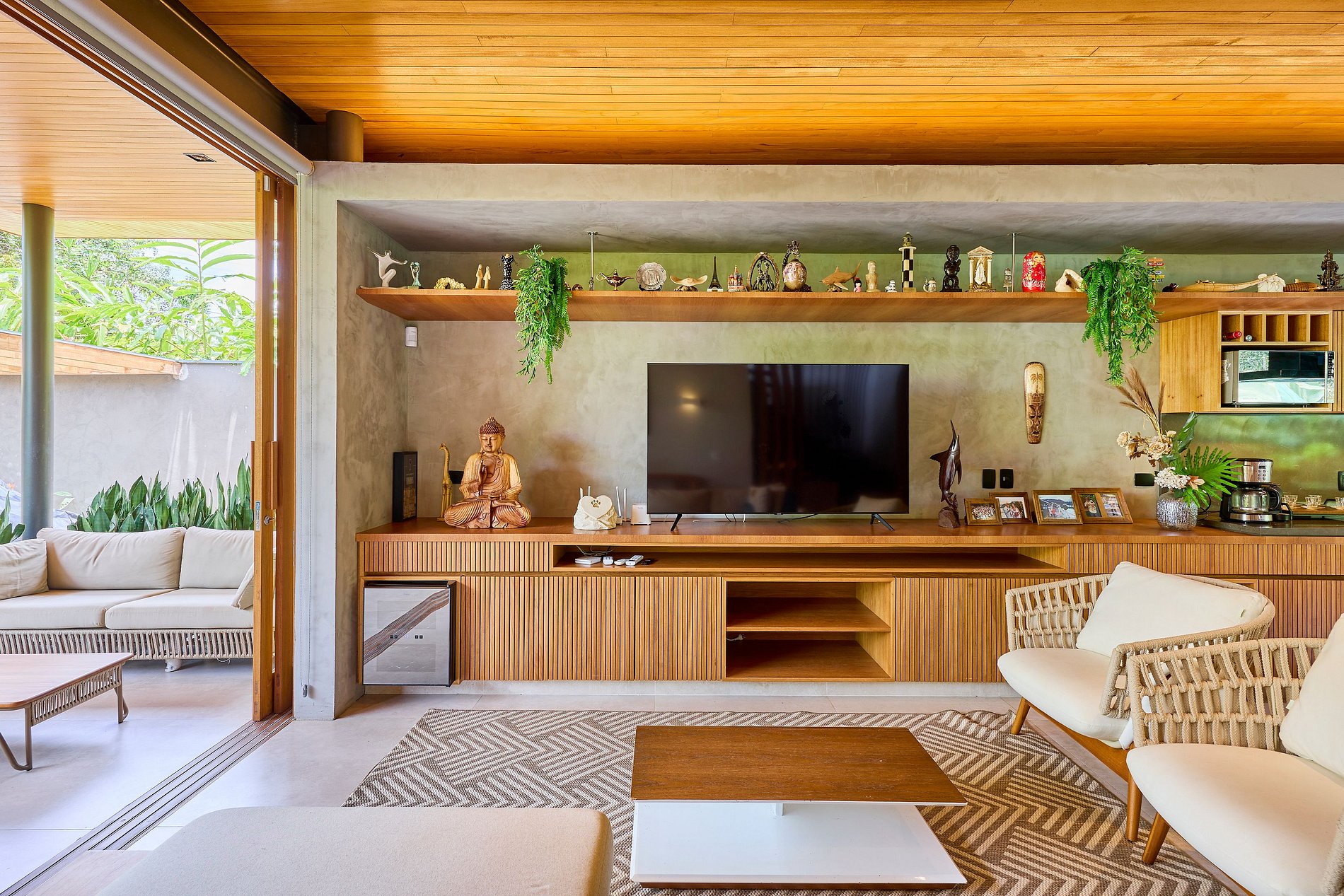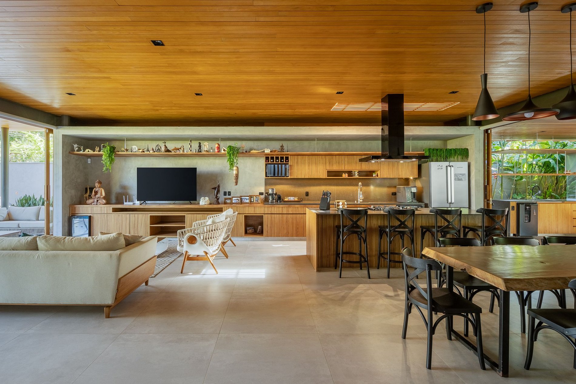 • Sala de estar: Smart TV com acesso a Netflix, Spotify e YouTube, integrada com a cozinha e a área externa.