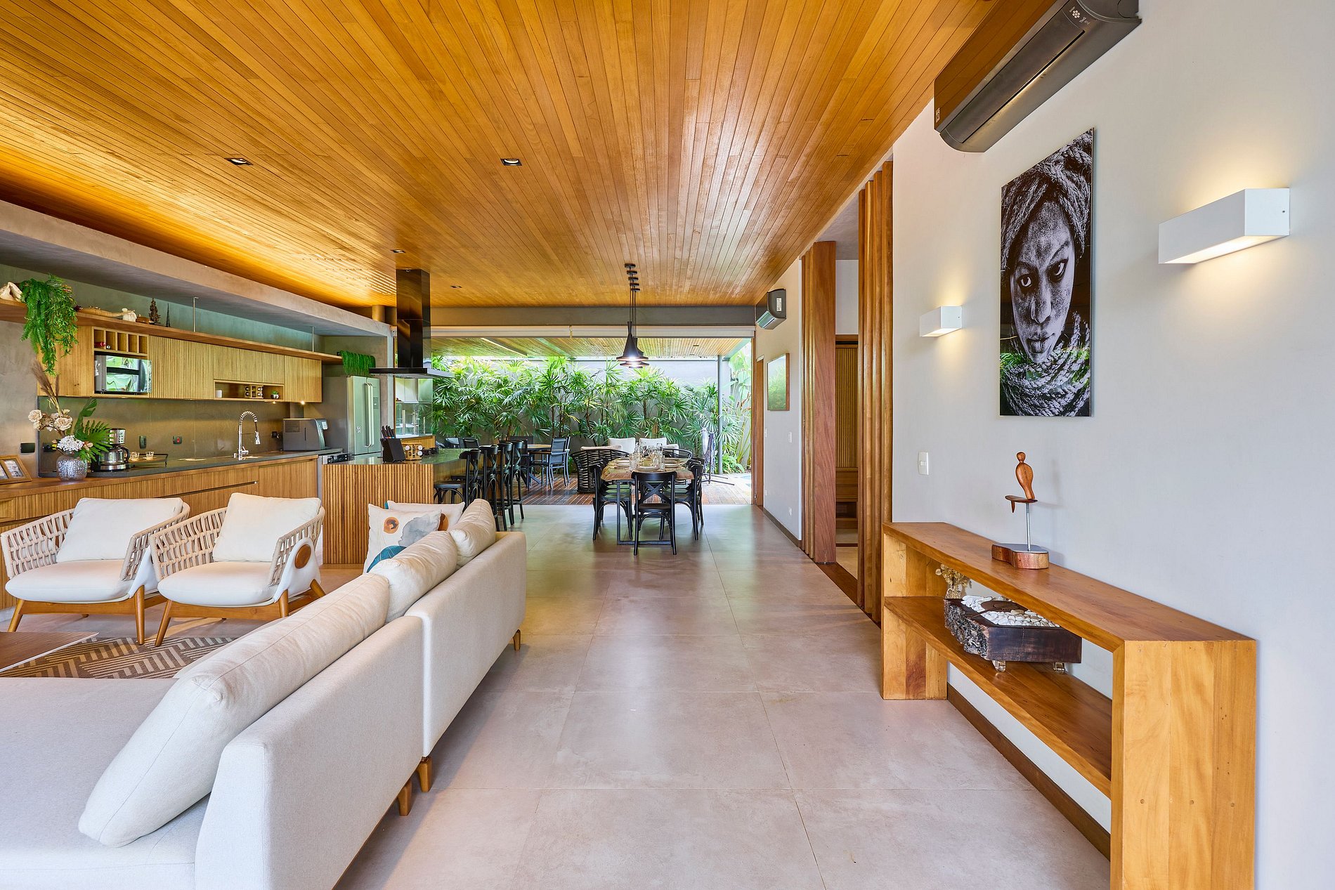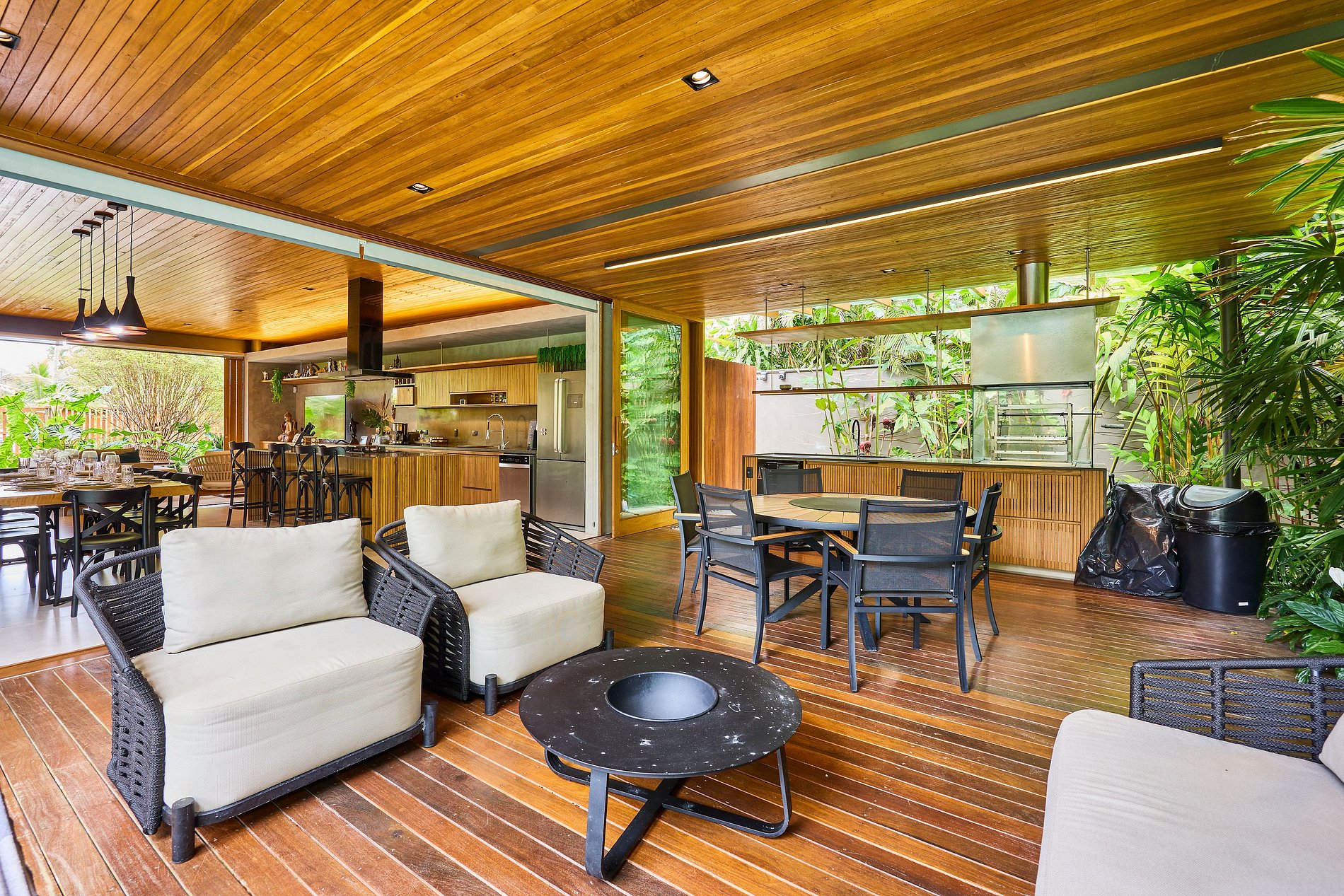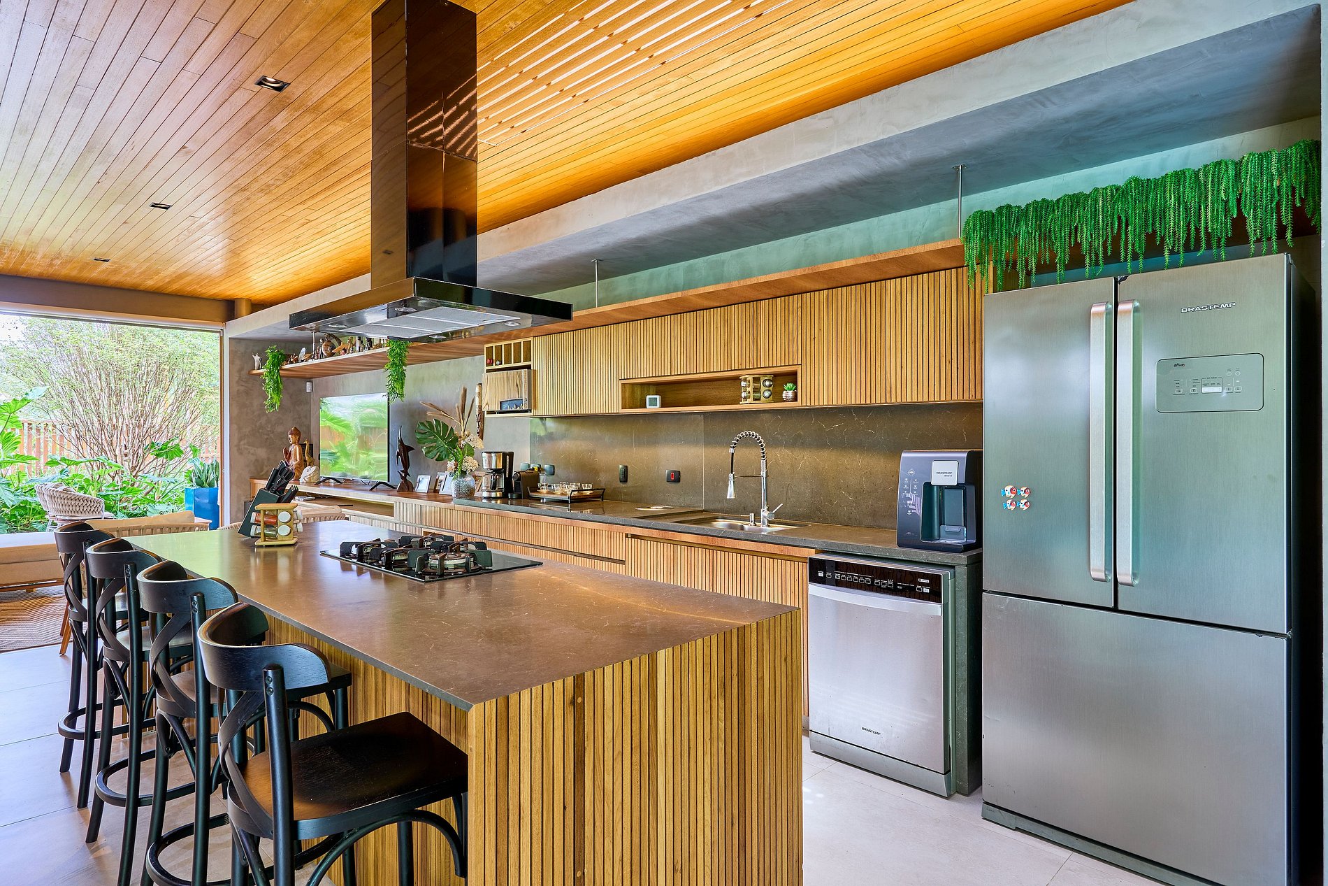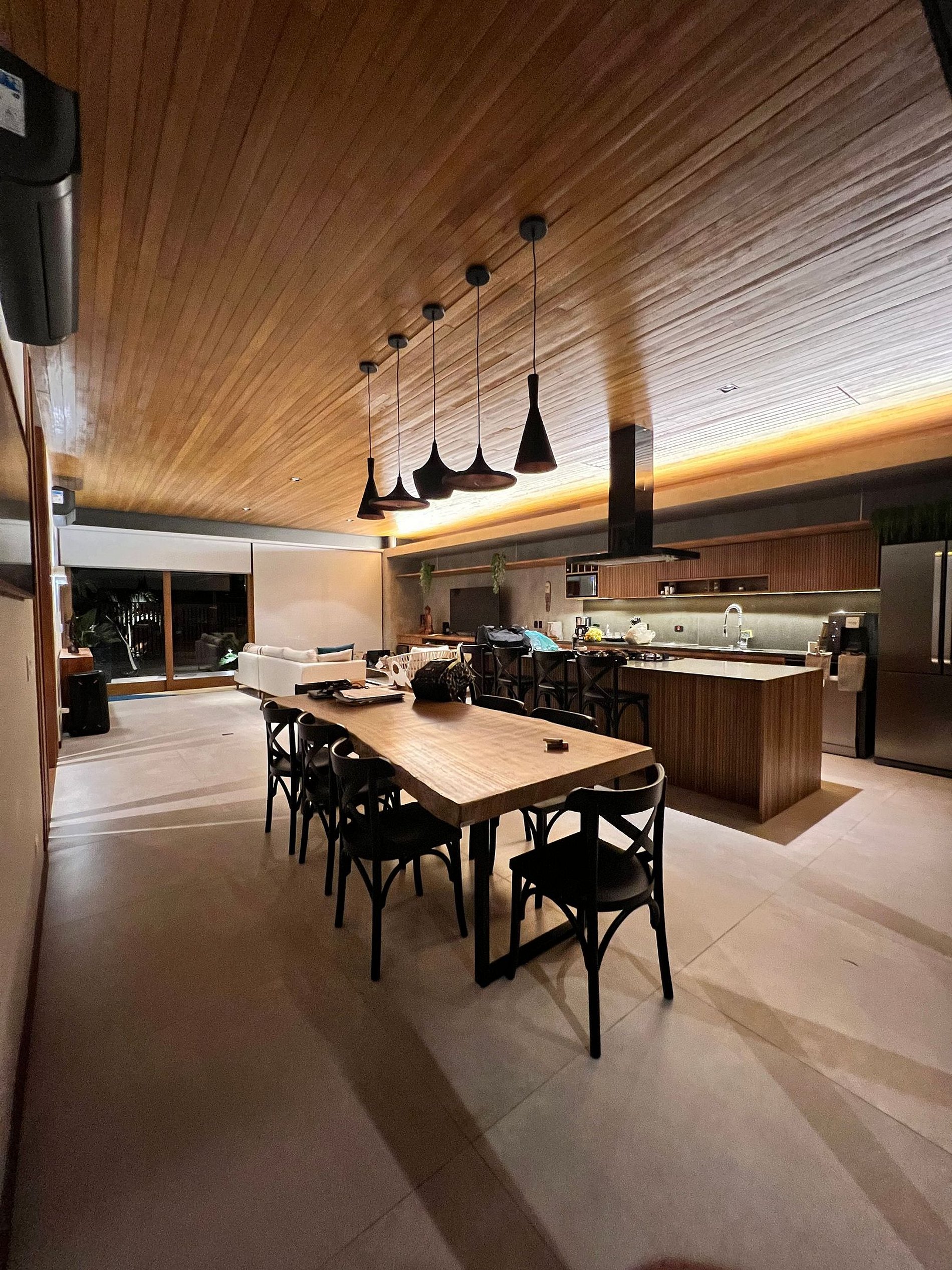 • Sala de estar: Smart TV com acesso a Netflix, Spotify e YouTube, integrada com a cozinha e a área externa.