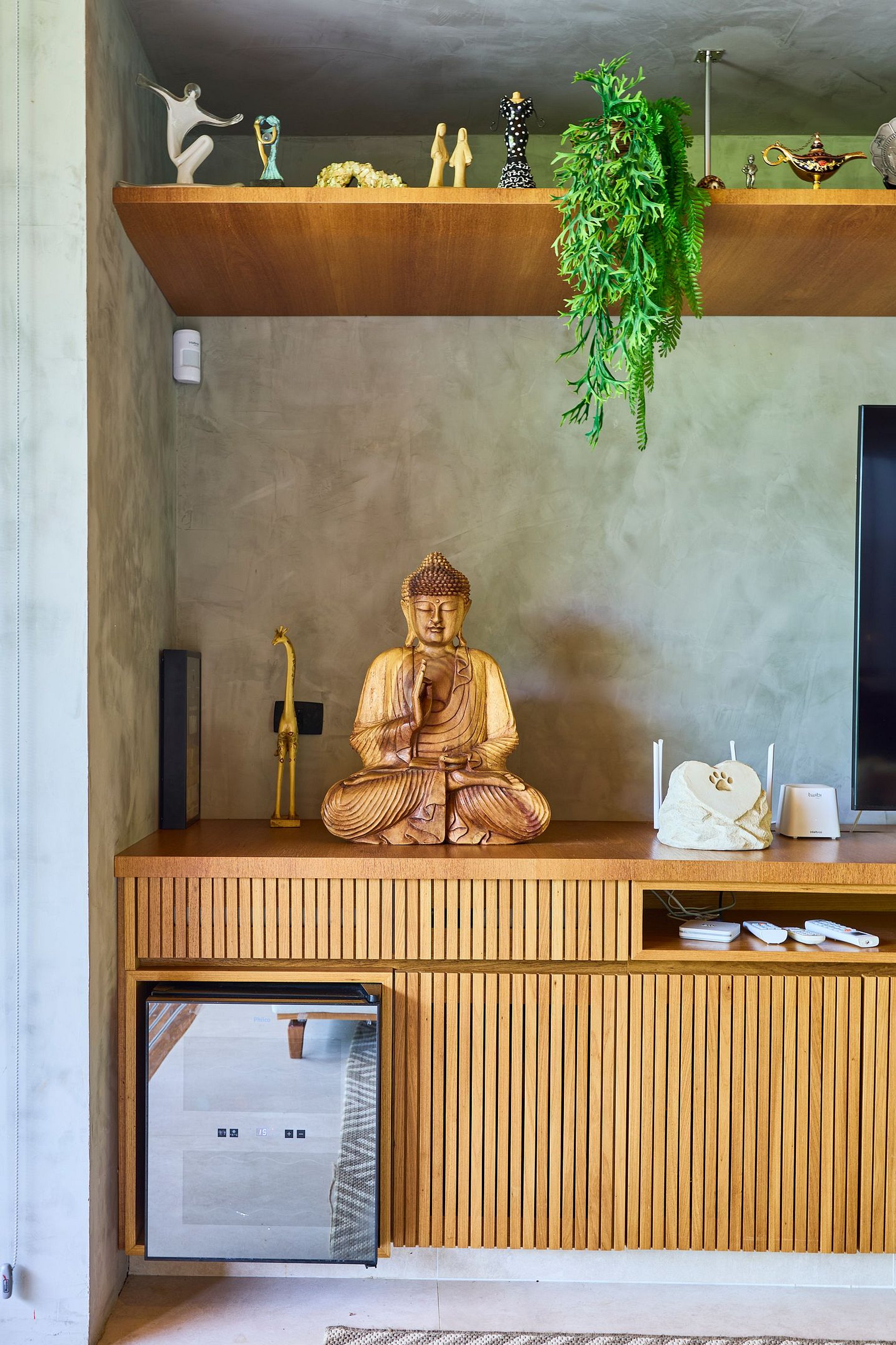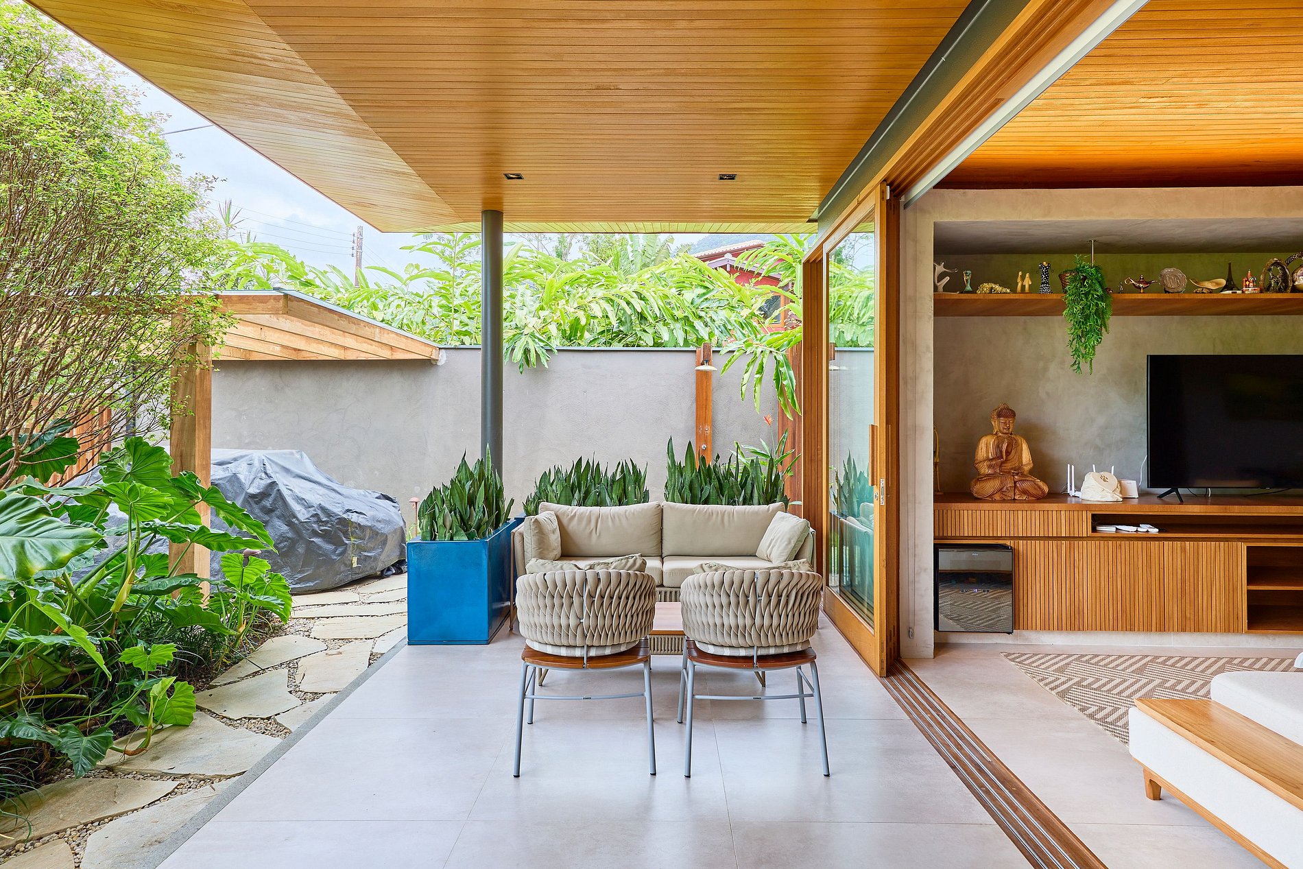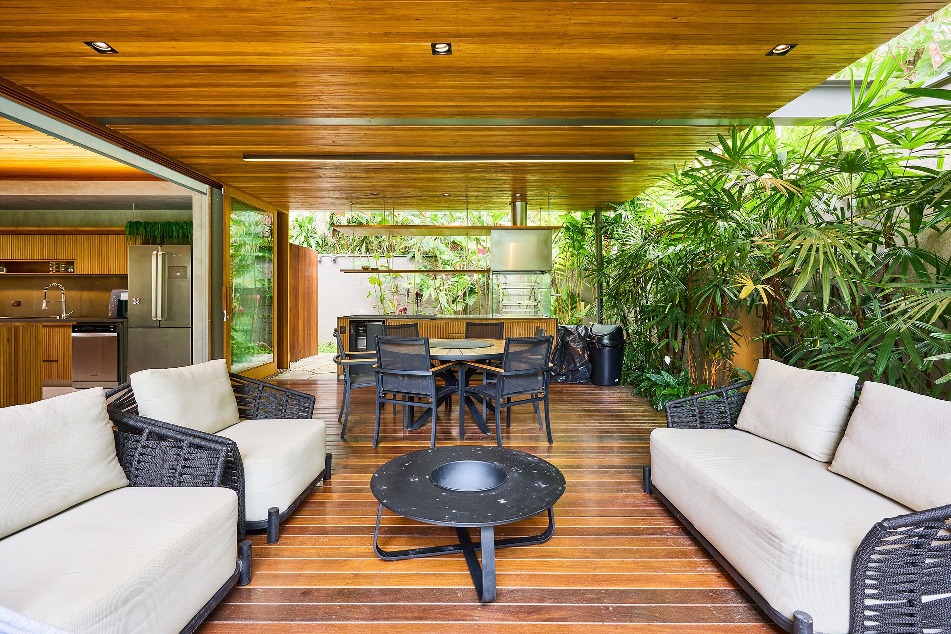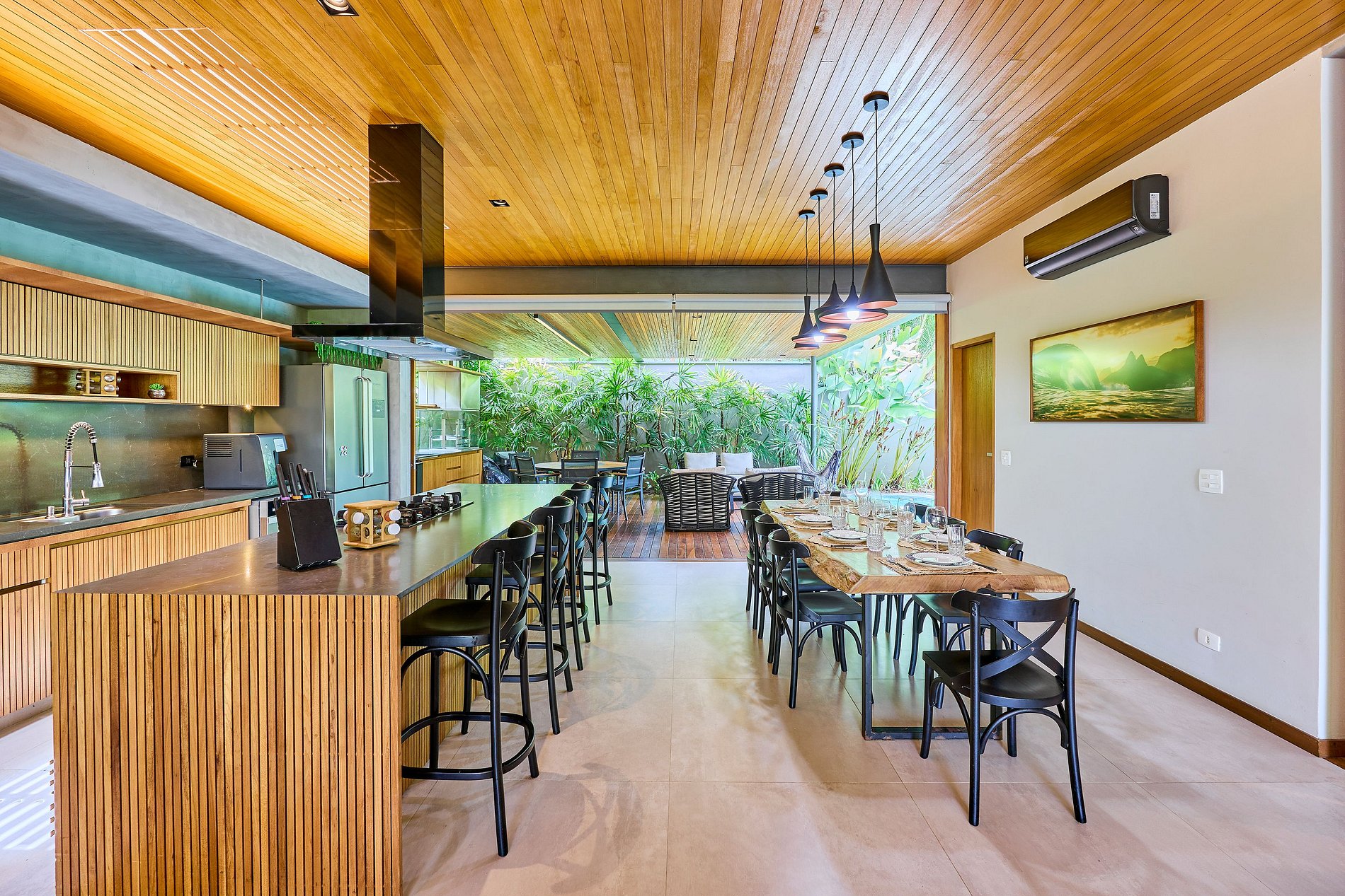 • Sala de estar: Smart TV com acesso a Netflix, Spotify e YouTube, integrada com a cozinha e a área externa.