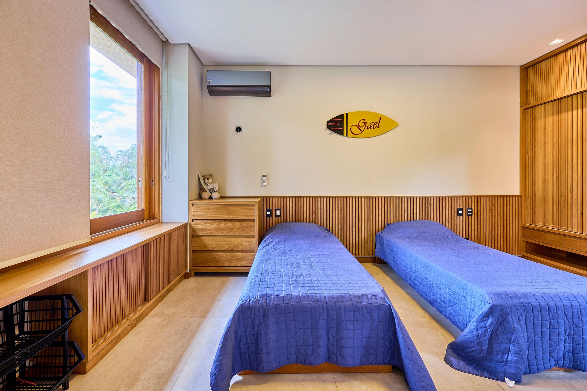 • Suíte 2: Duas camas de solteiro (opção de transformar em cama de casal) + 1 cama auxiliar, ar-condicionado (acomoda 3 pessoas).
