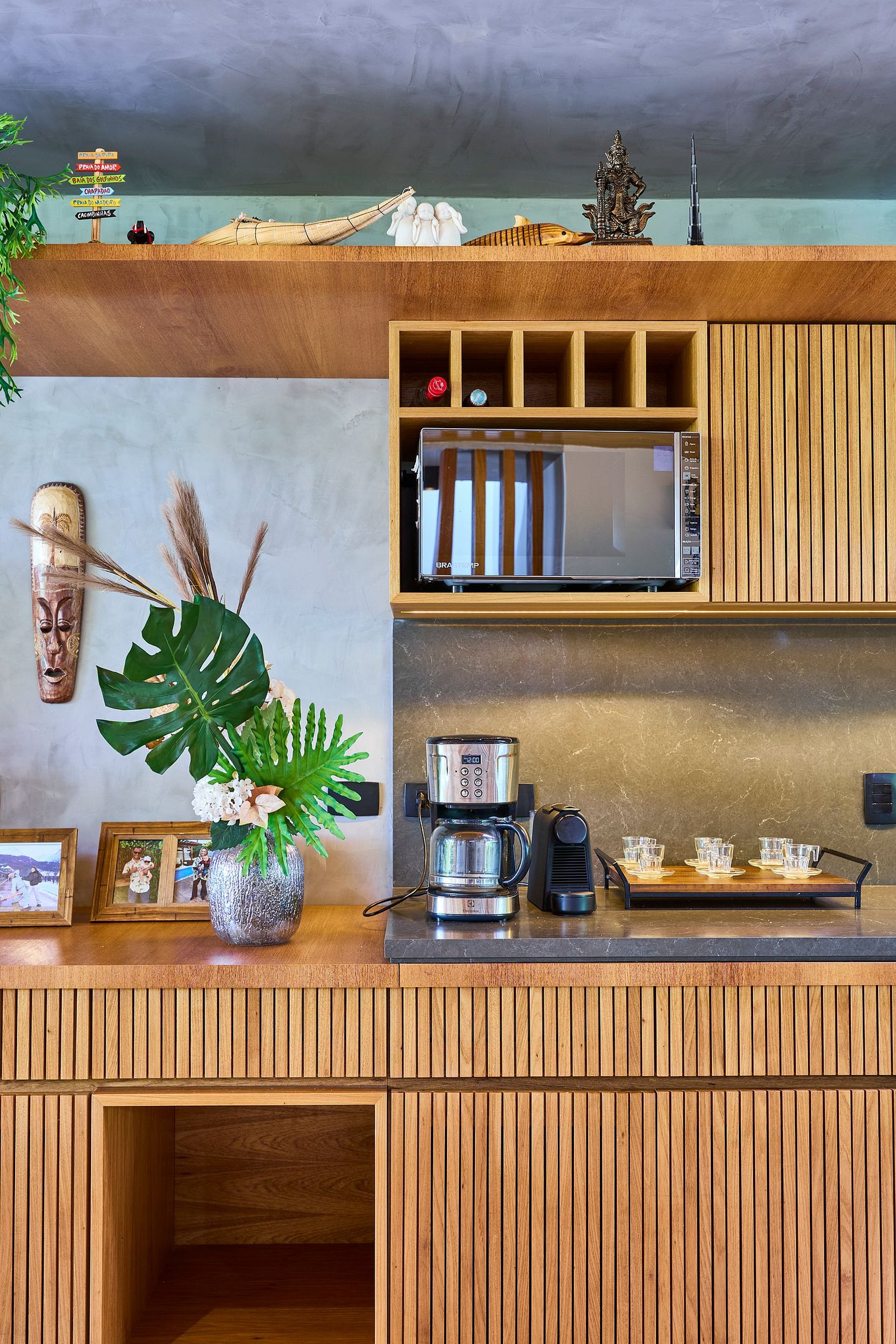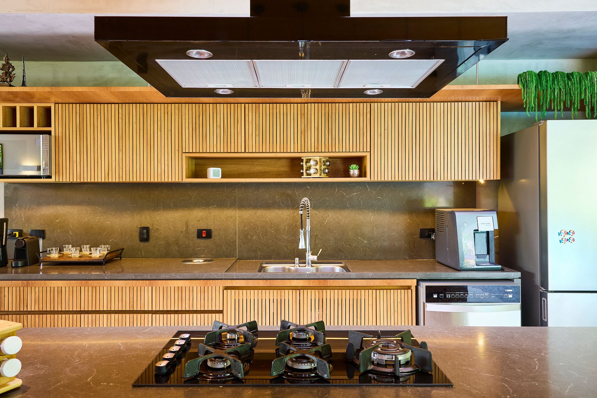 • Cozinha completa: Equipada com cooktop, geladeira grande, forno elétrico, liquidificador, cafeteira, torradeira, sanduicheira, micro-ondas, purificador de água com opção gelada e todos os utensílios necessários.