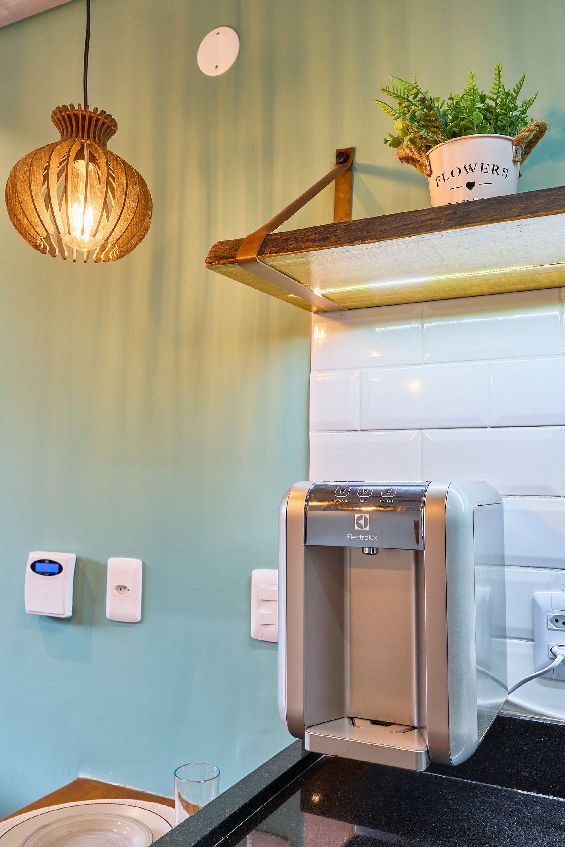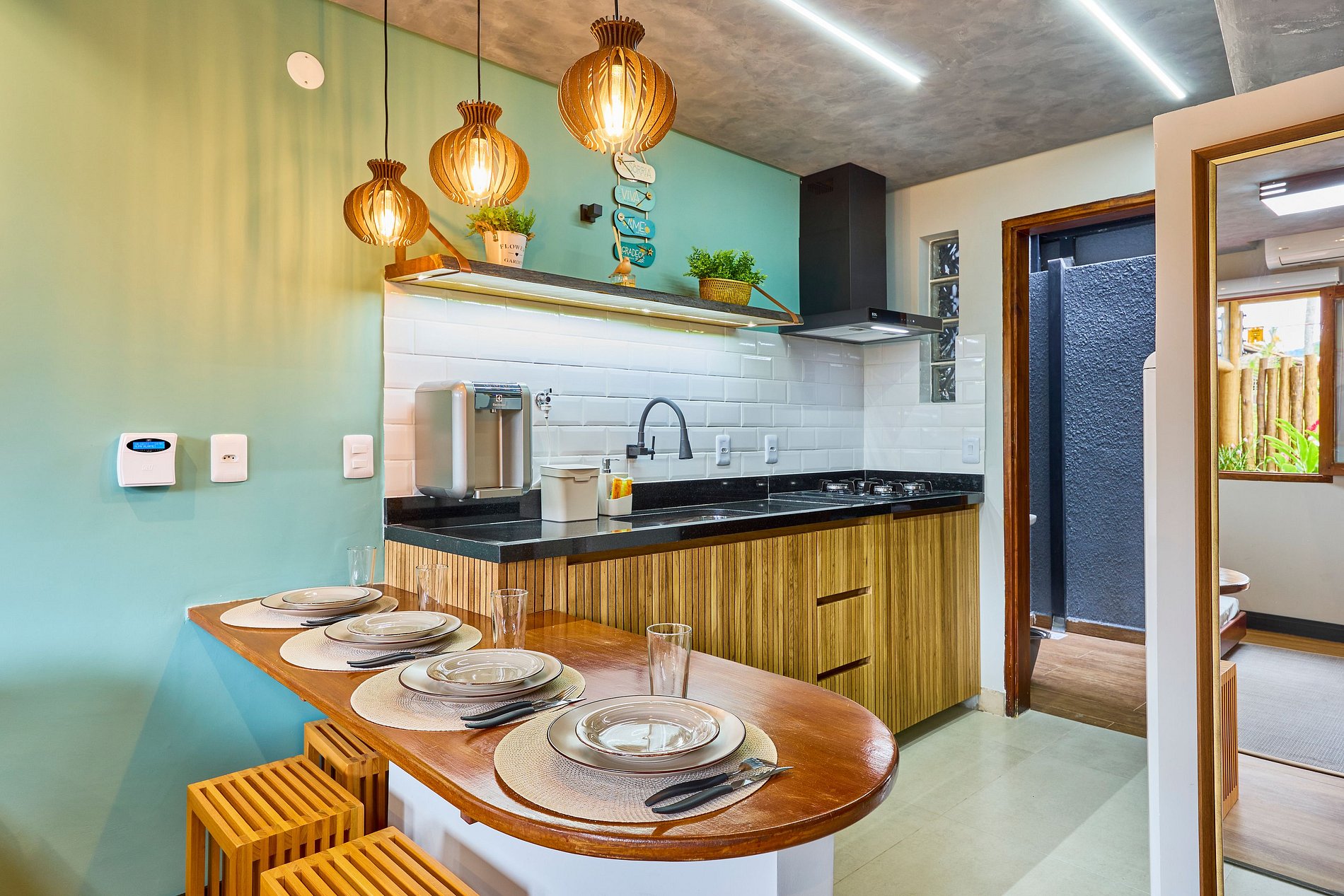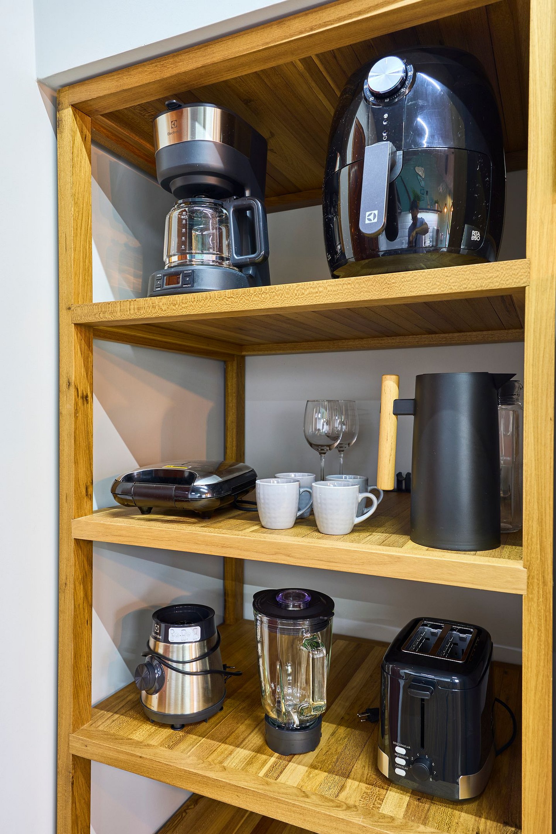 Cozinha toda equipada com cooktop, geladeira, arfryer, liquidificador, cafeteira, torradeira, lancheira, micro-ondas, purificador de água (opção gelada) e todos utensílios para preparar suas refeições.