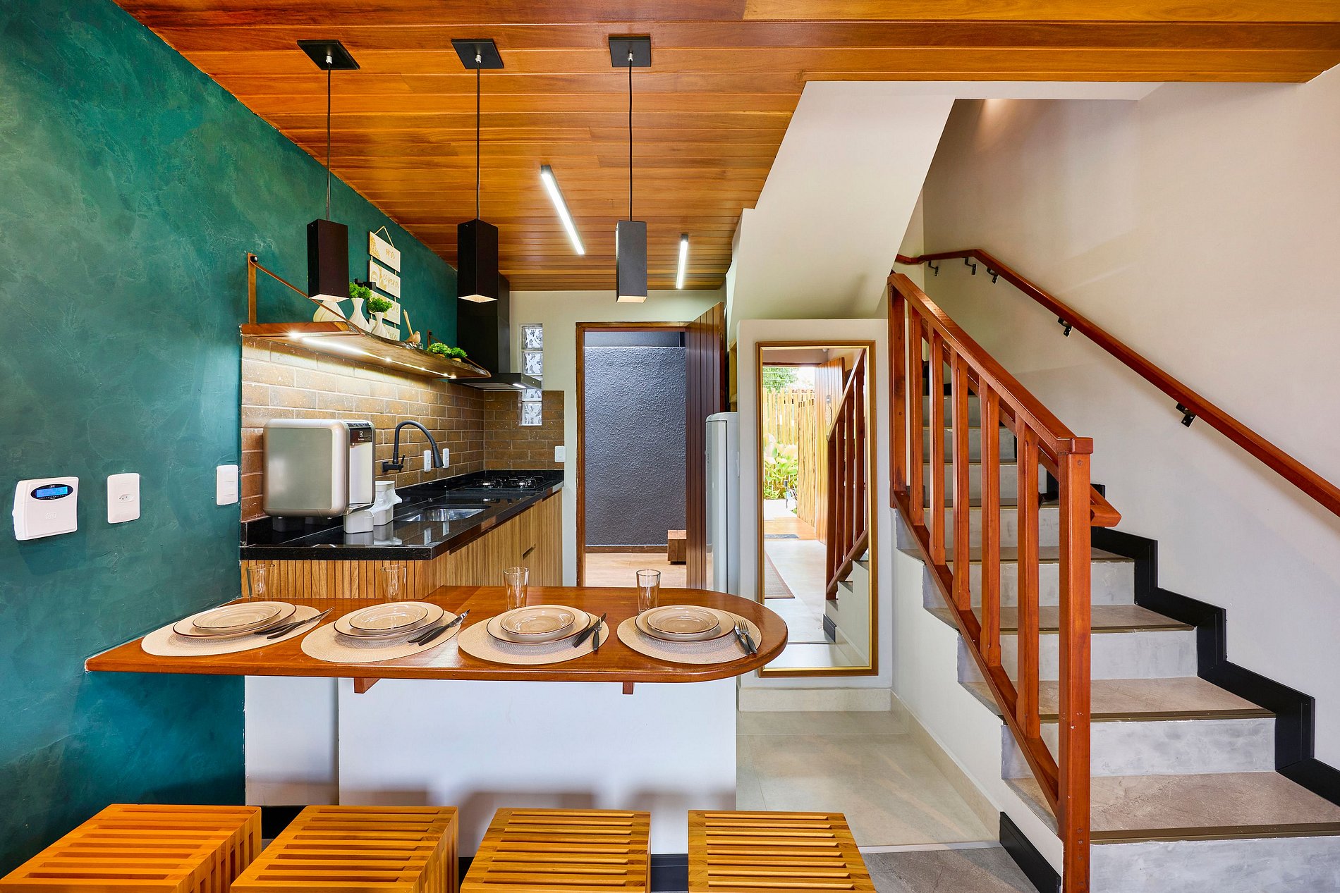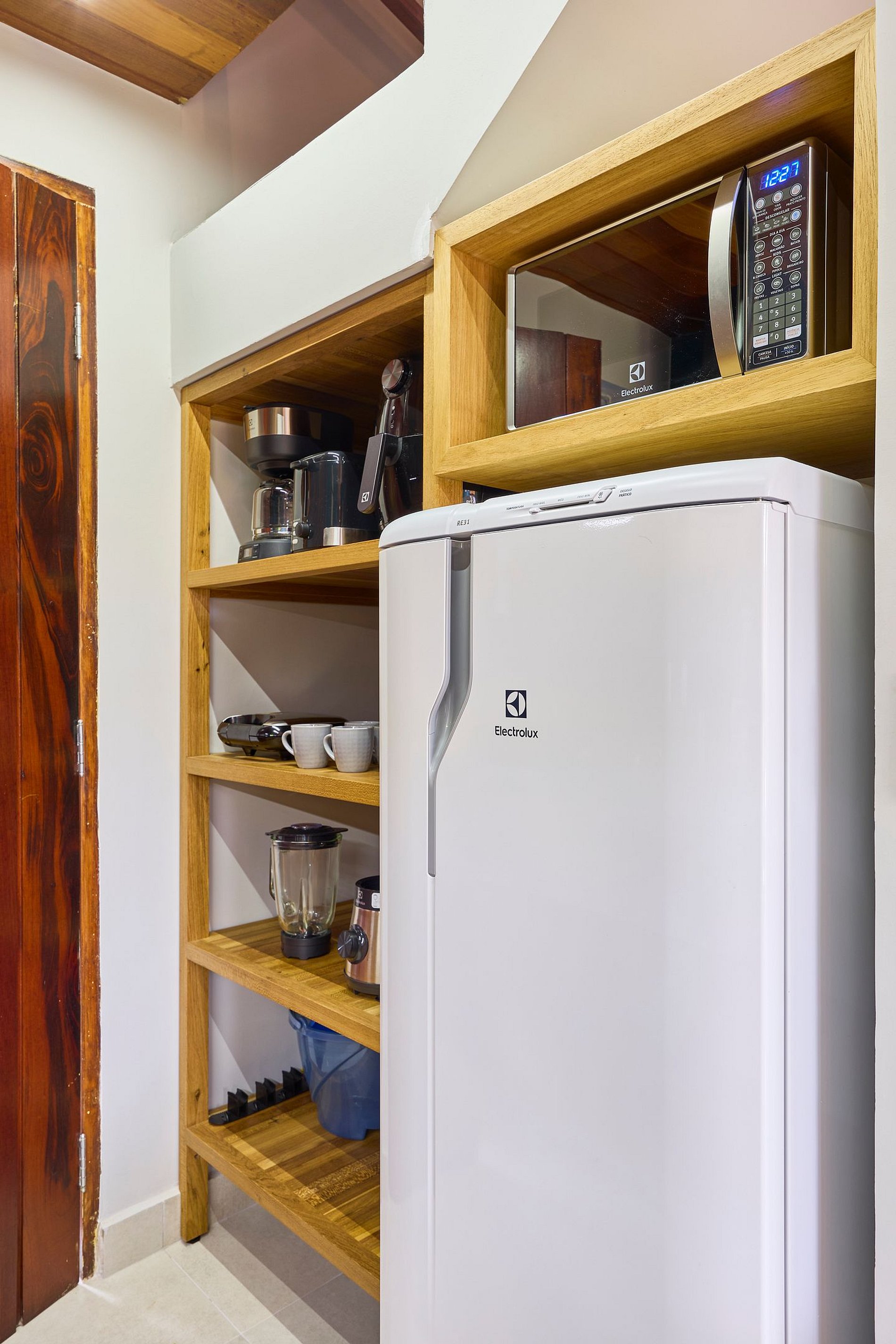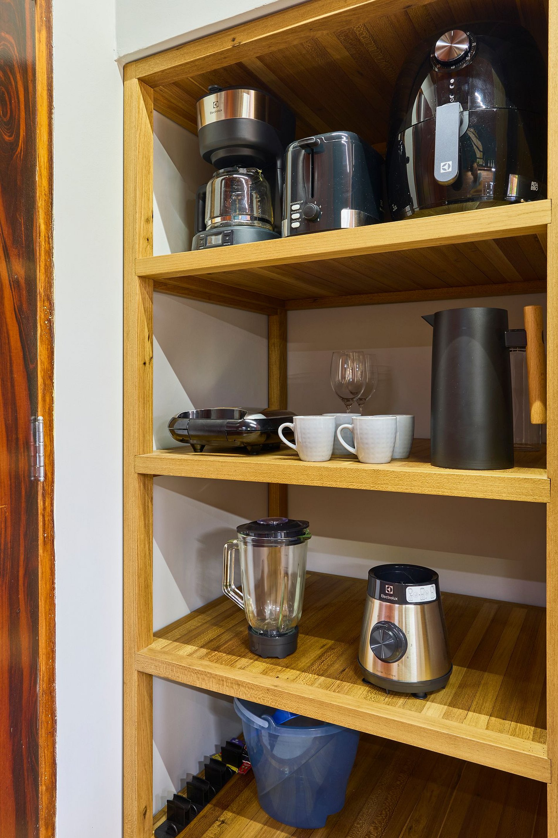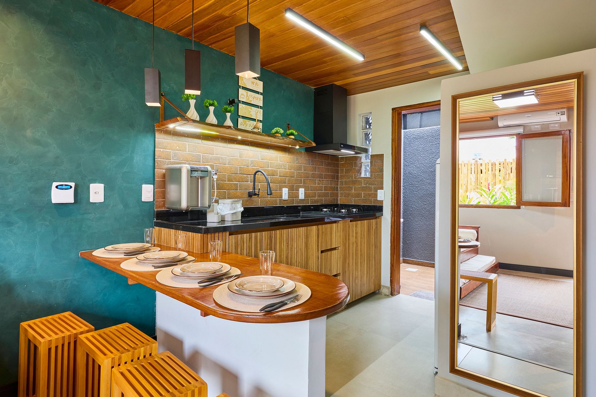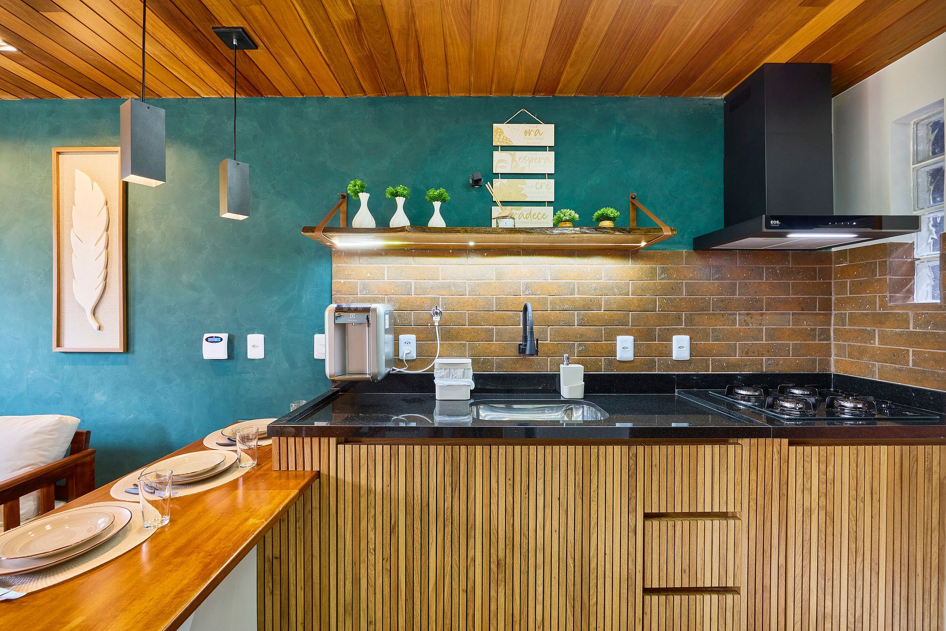 Cozinha toda equipada com cooktop, geladeira, arfryer, liquidificador, cafeteira, torradeira, lancheira, micro-ondas, purificador de água (opção gelada) e todos utensílios para preparar suas refeições.