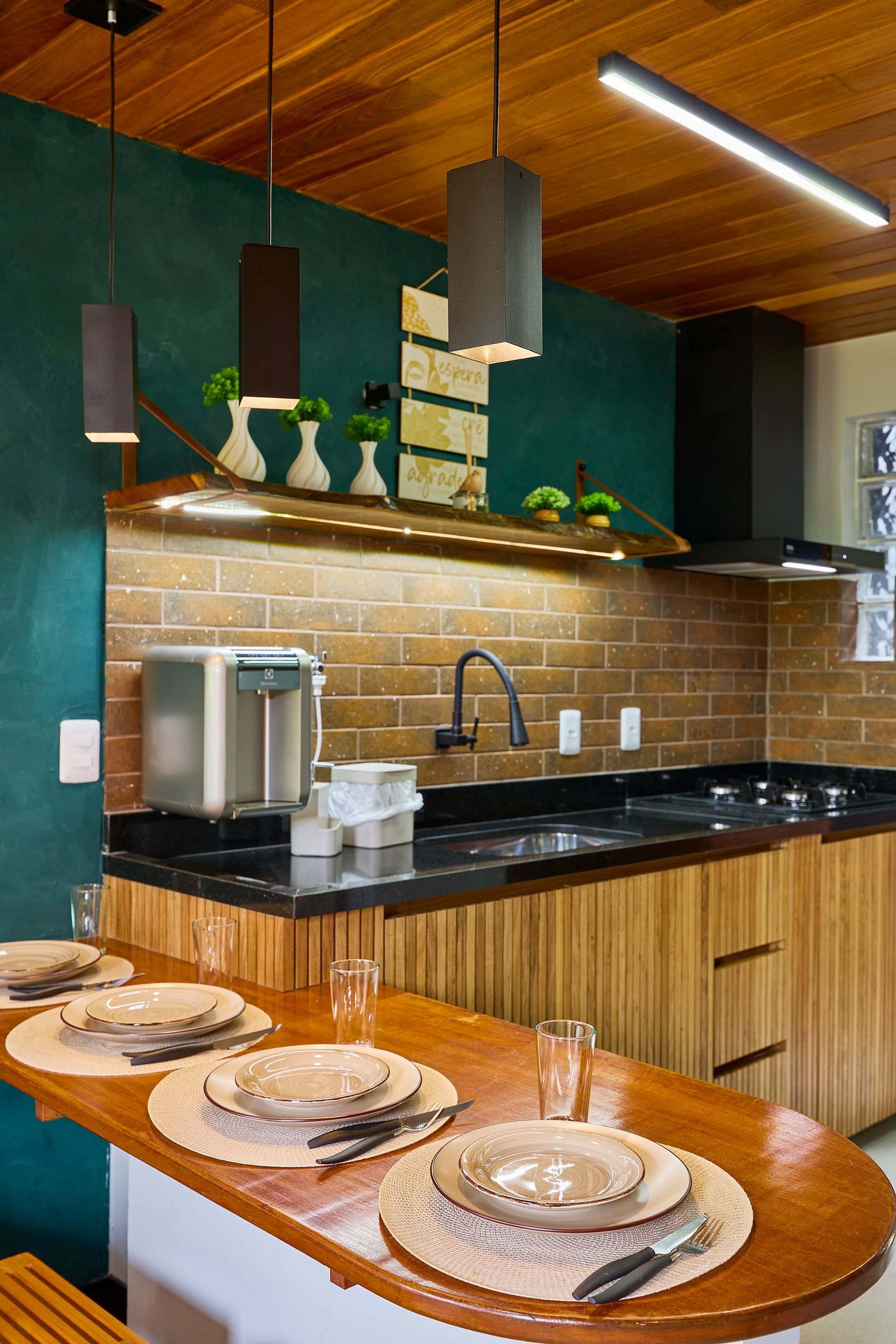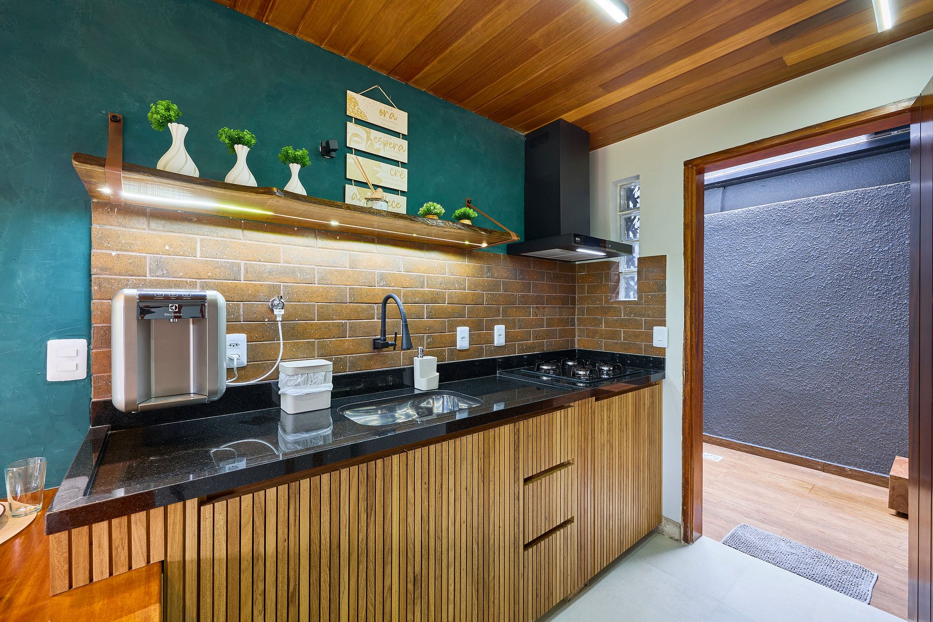 Cozinha toda equipada com cooktop, geladeira, arfryer, liquidificador, cafeteira, torradeira, lancheira, micro-ondas, purificador de água (opção gelada) e todos utensílios para preparar suas refeições.