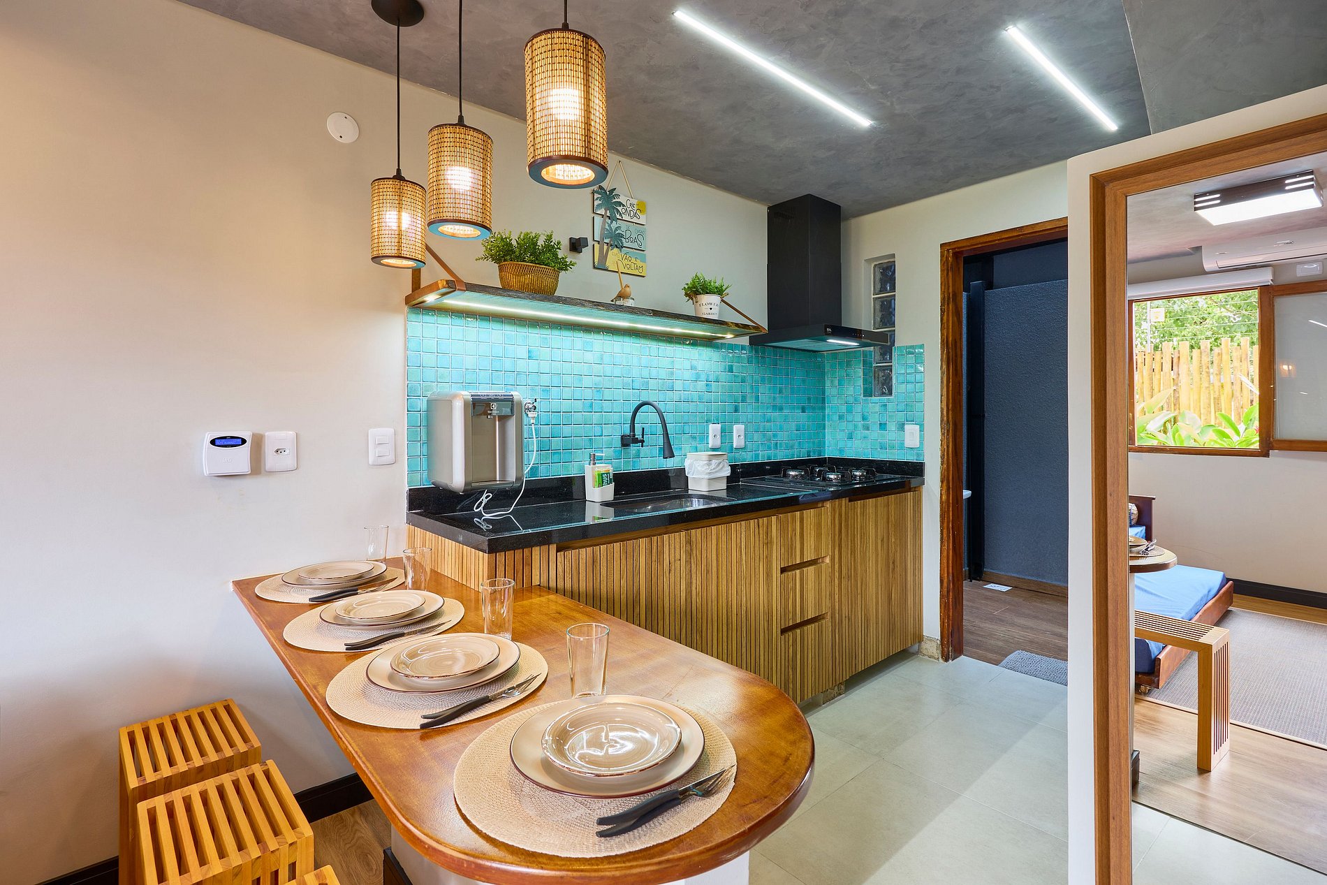 Cozinha toda equipada com cooktop, geladeira, arfryer, liquidificador, cafeteira, torradeira, lancheira, micro-ondas, purificador de água (opção gelada) e todos utensílios para preparar suas refeições.