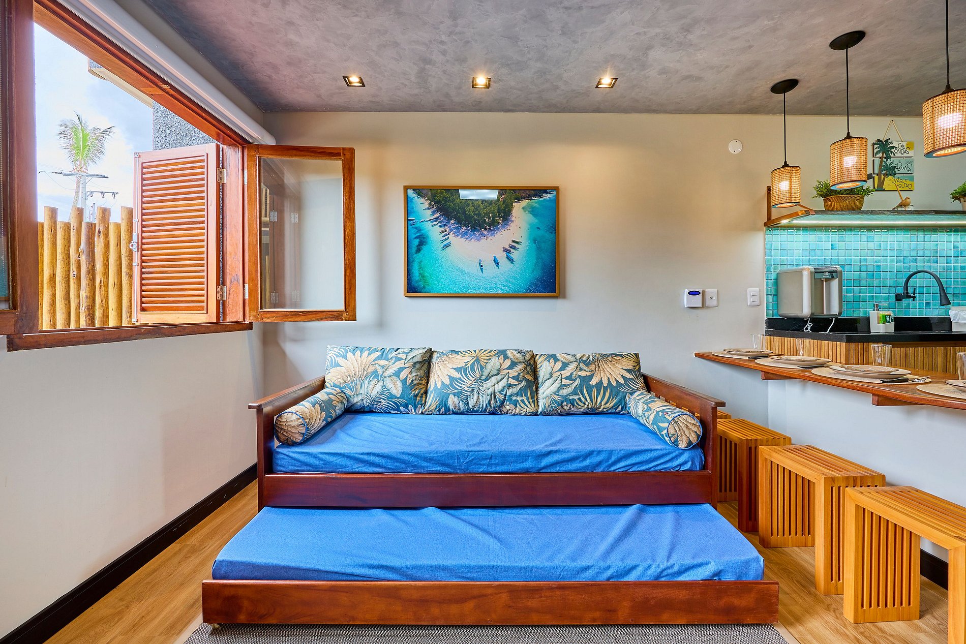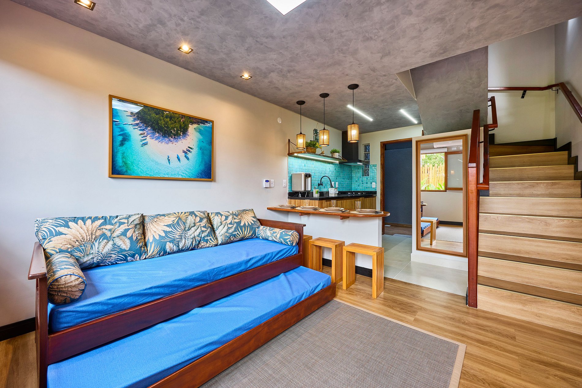 Sala de Estar : com ar e Sofá cama solteito + cama auxiliar ( acomoda 2 pessoas)