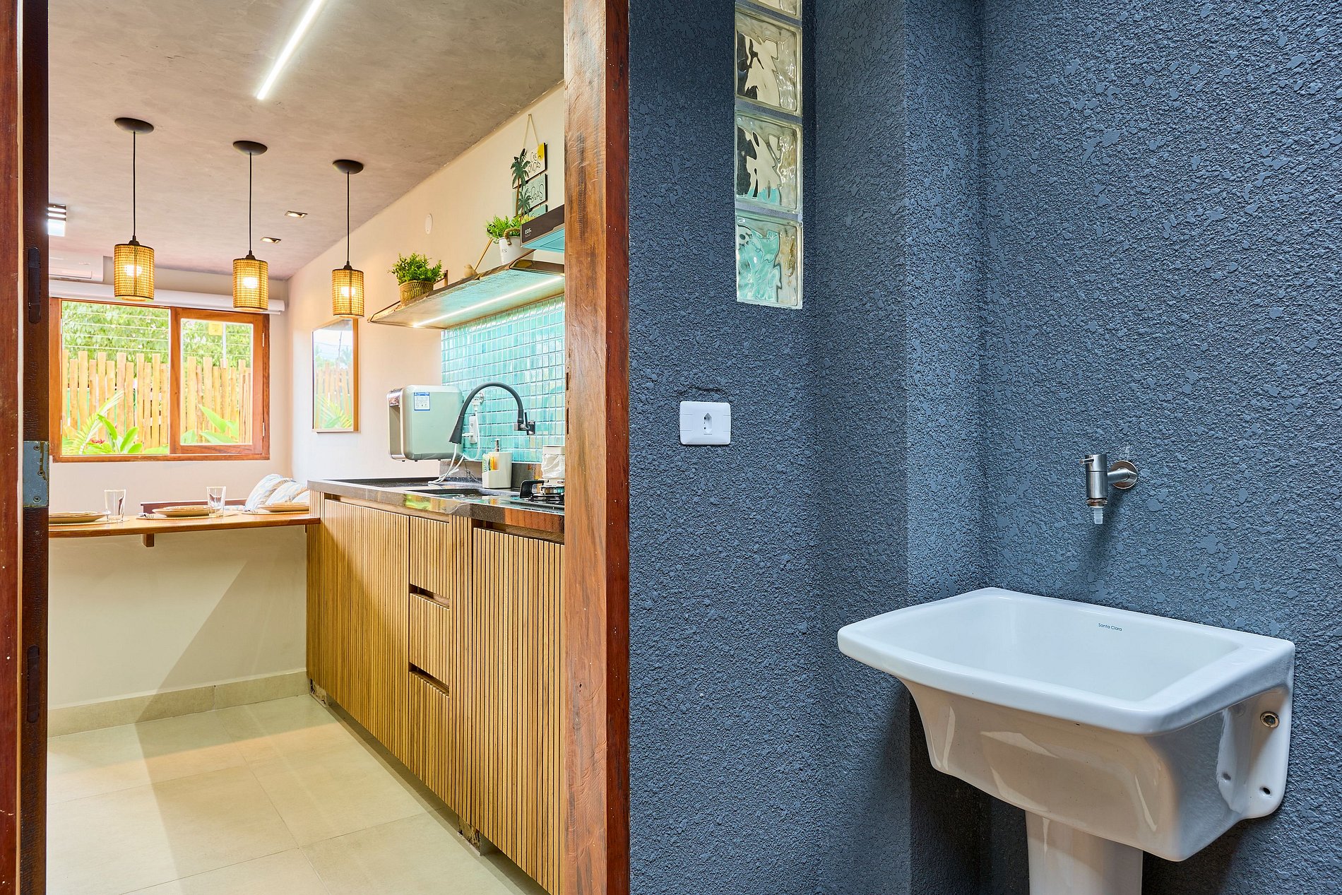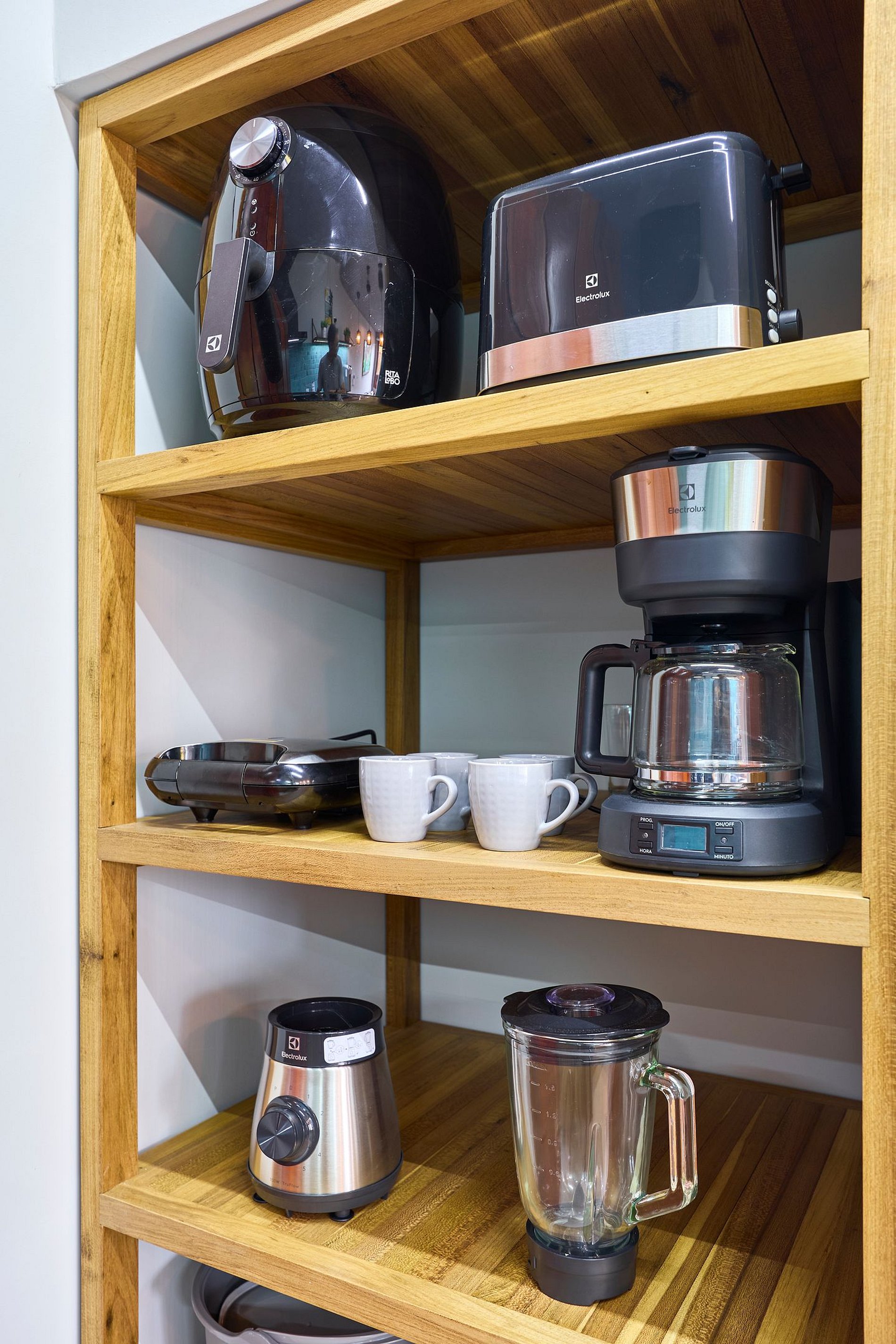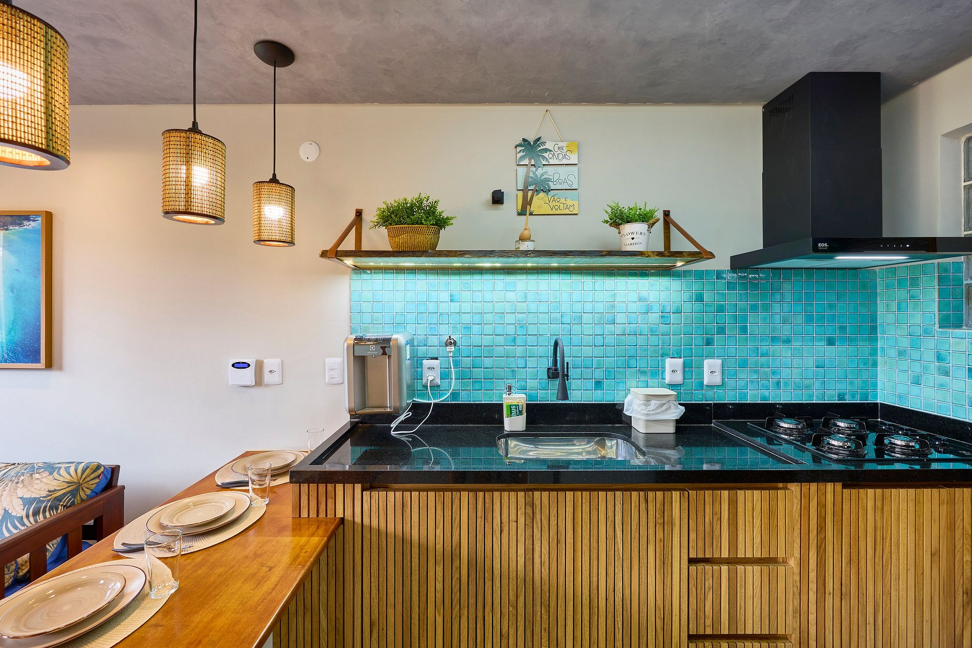Cozinha toda equipada com cooktop, geladeira, arfryer, liquidificador, cafeteira, torradeira, lancheira, micro-ondas, purificador de água (opção gelada) e todos utensílios para preparar suas refeições.