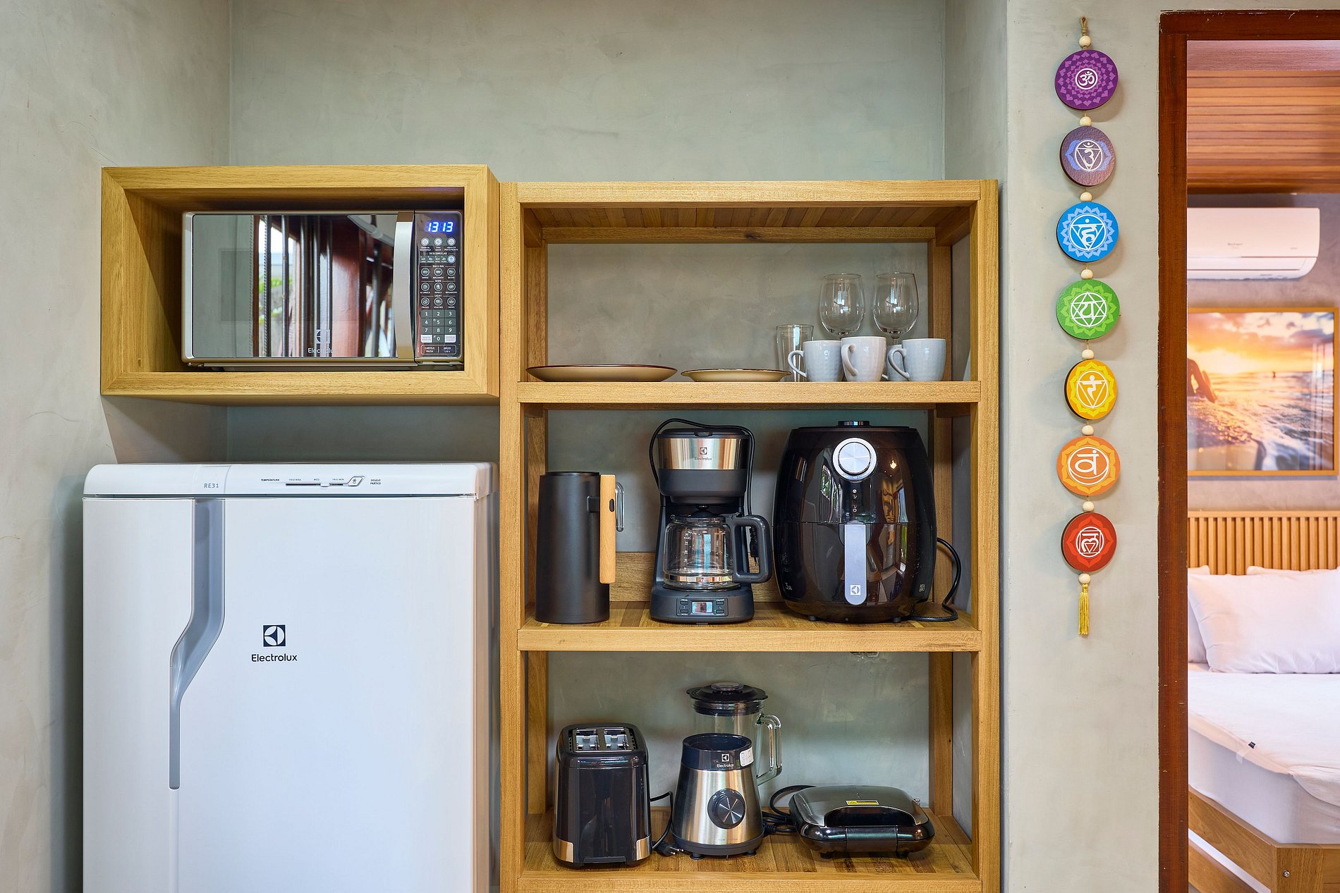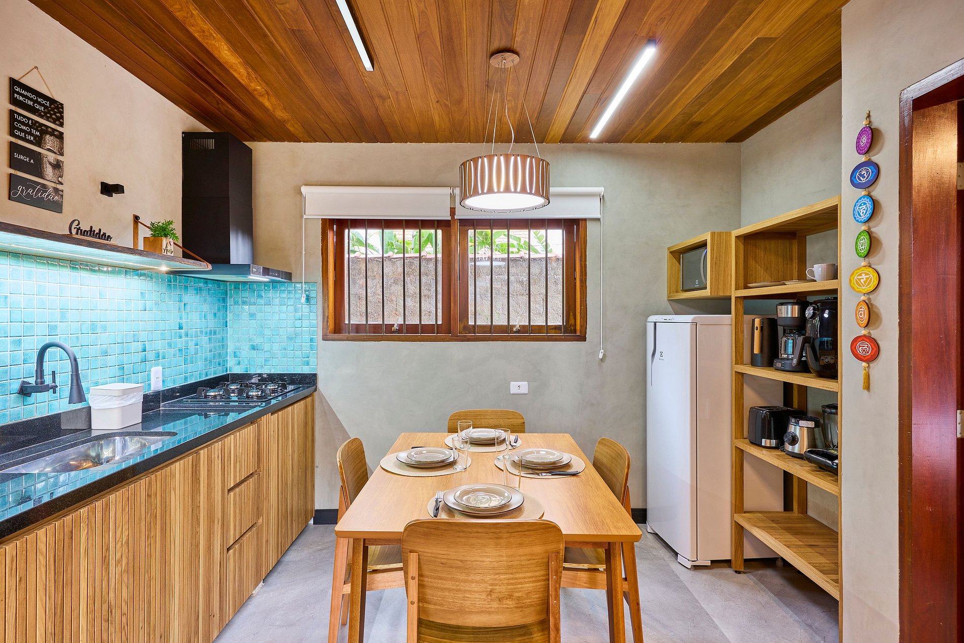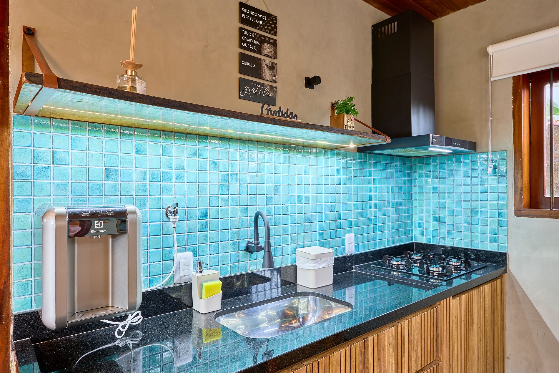 Cozinha toda equipada com cooktop, geladeira, air fryer, liquidificador, cafeteira, torradeira, sanduicheira, cafeteira, micro-ondas, purificador de água (opção gelada) e todos utensílios para preparar suas refeições.